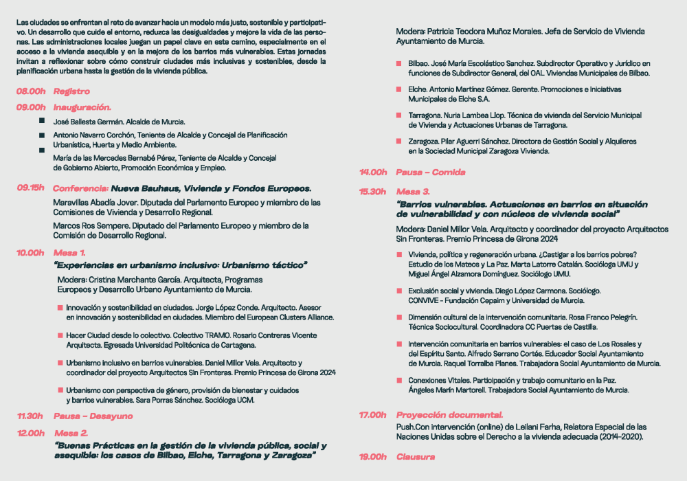 La jornada reunirá a personas expertas y profesionales para compartir ideas y experiencias sobre cómo mejorar nuestros barrios y favorecer el acceso a la vivienda, abordando algunos de los retos actuales relacionados con el derecho a la vivienda y el desarrollo urbano.